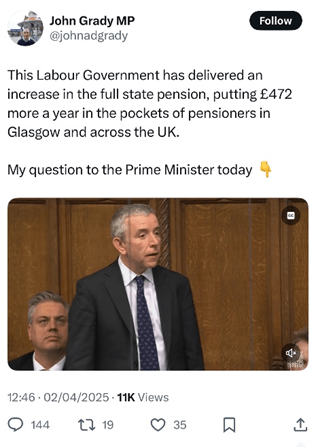 John Grady, the Labour MP from Glasgow East, asked: “Does the Prime Minister agree with me that this rise [in the full state pension] is only possible because of Labour’s plans for change and our commitment to the triple lock?”
