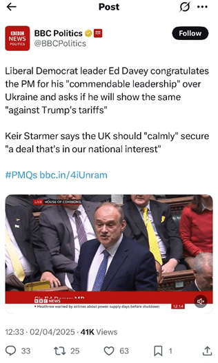“Will the Prime Minister now provide similar leadership with an ‘economic coalition of the willing’ against Trump’s tariffs, for free trade, so we can avoid a global trade war and economic recession?” Sir Ed asked.