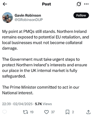 DUP leader, Gavin Robinson, MP for Belfast East, has asked about the potential impact of tariffs on Northern Ireland post-Brexit.