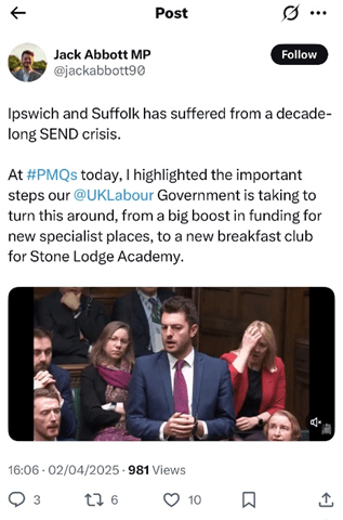 Jack Abbott, Labour MP for Ipswich, has said that a special school in Ipswich will be one of the first in the country to benefit from a new breakfast club this month.