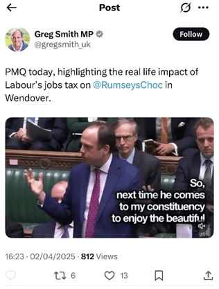 Greg Smith, Conservative MP for Mid-Buckinghamshire, has asked about the impact of Labour’s “jobs tax” and that it has led to businesses in his constituency laying off staff.